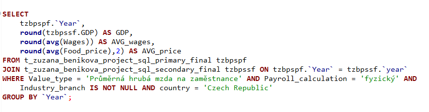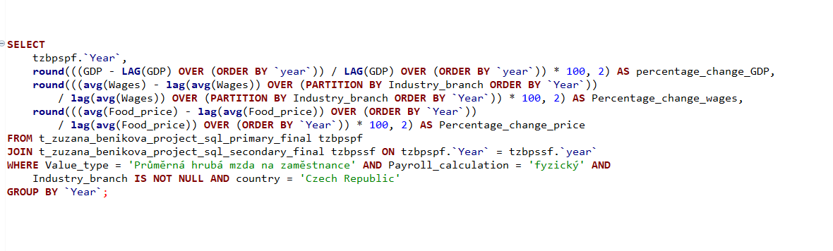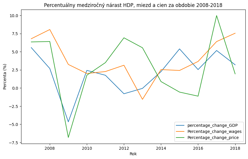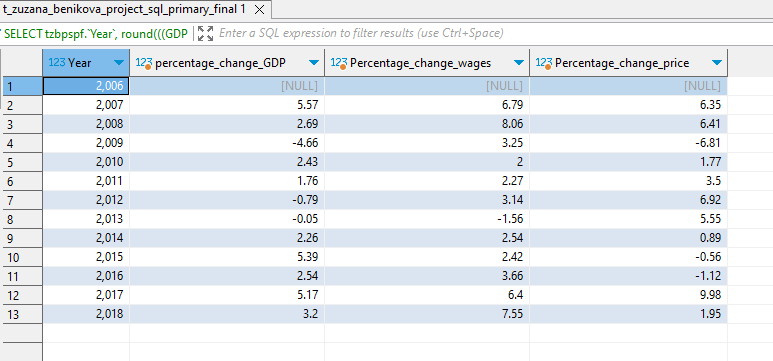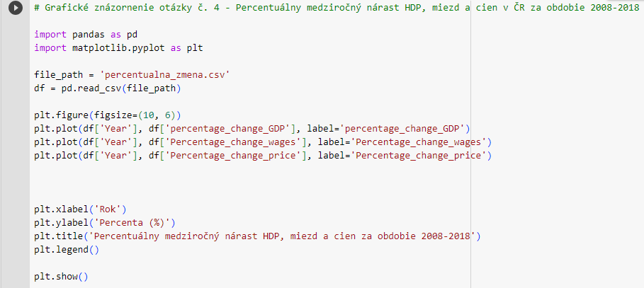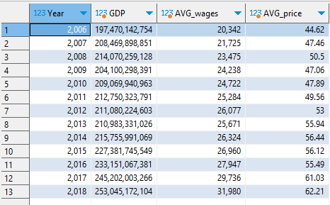 Z datasetu prostredníctvom select dotazu sme získali údaje, pre porovnanie medziročnej zmeny (nárast alebo pokles) miezd a cien potravín. V nadväznosti na ďalšie spracovanie sme do grafu pridali aj medziročný nárast HDP.