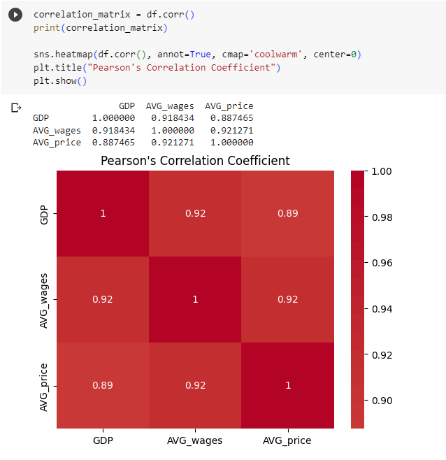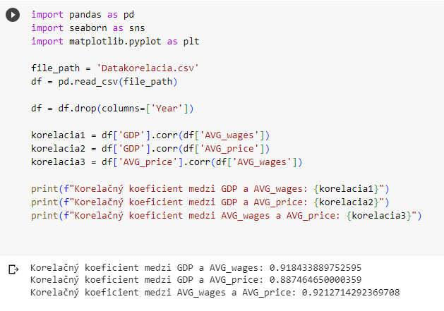 Korelačný koeficient medzi HDP a priemernými mzdami je zaokrúhlene 0,92. Korelačný koeficient medzi HDP a priemernými cenami je zaokrúhlene 0,89. Korelačný koeficient medzi priemernými mzdami a priemernými cenami je zaokrúhlene 0,92.